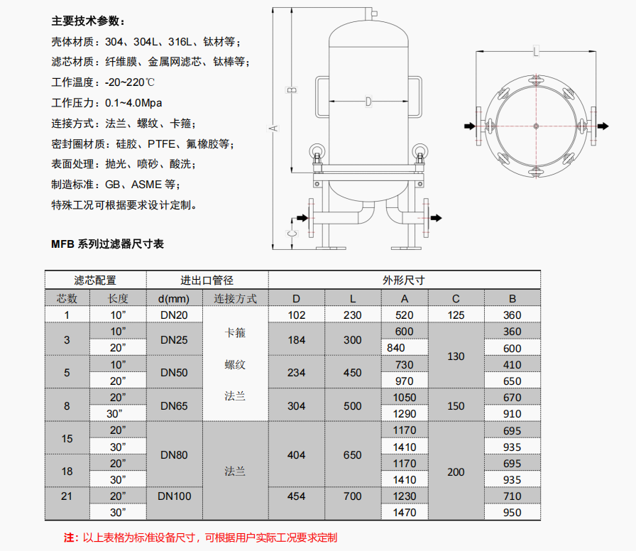 產品描述: JN-MFB 系列過濾器殼體內部濾芯托盤可設計為活動式結構后, 便于清理內壁死角區(qū)。過濾器殼體全部采用優(yōu)質 304 316L 銹鋼材料制造,每臺過濾器都是經(jīng)過嚴格的選材及精心制造而 成,保證完全無裂縫的流線型設計,具有良好的表面和最大的耐 腐蝕能力,以達到防止細菌污染的質量標準,衛(wèi)生級過濾器套筒 獨特的結構,使每一個套筒的內外表面均沒有死角、可完全拆洗, 操作方便。 MFB 系列精密過濾器廣泛用于食品、制藥、化工、電子等領域 的流體后過濾工藝,如水、氨、油品、甲醇、燒堿及各種化工溶 劑精過濾等。